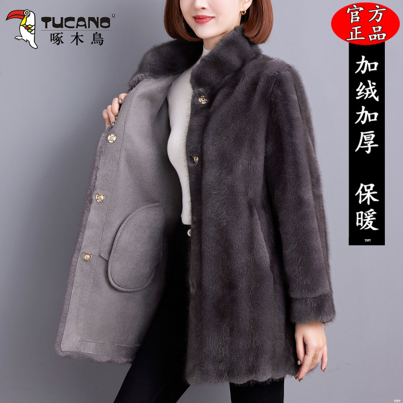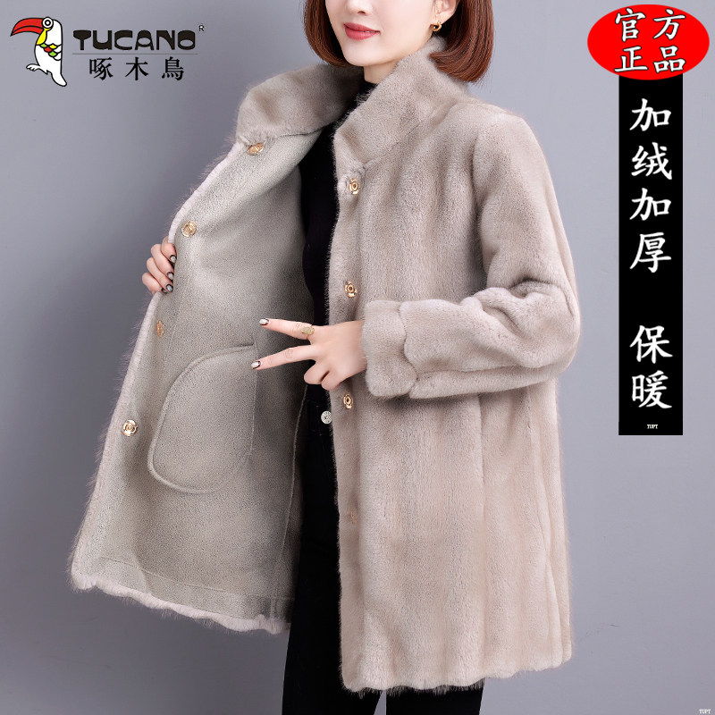 啄木鸟中长款皮毛一体外套2025冬季新款宽松加厚保暖立领皮草上衣