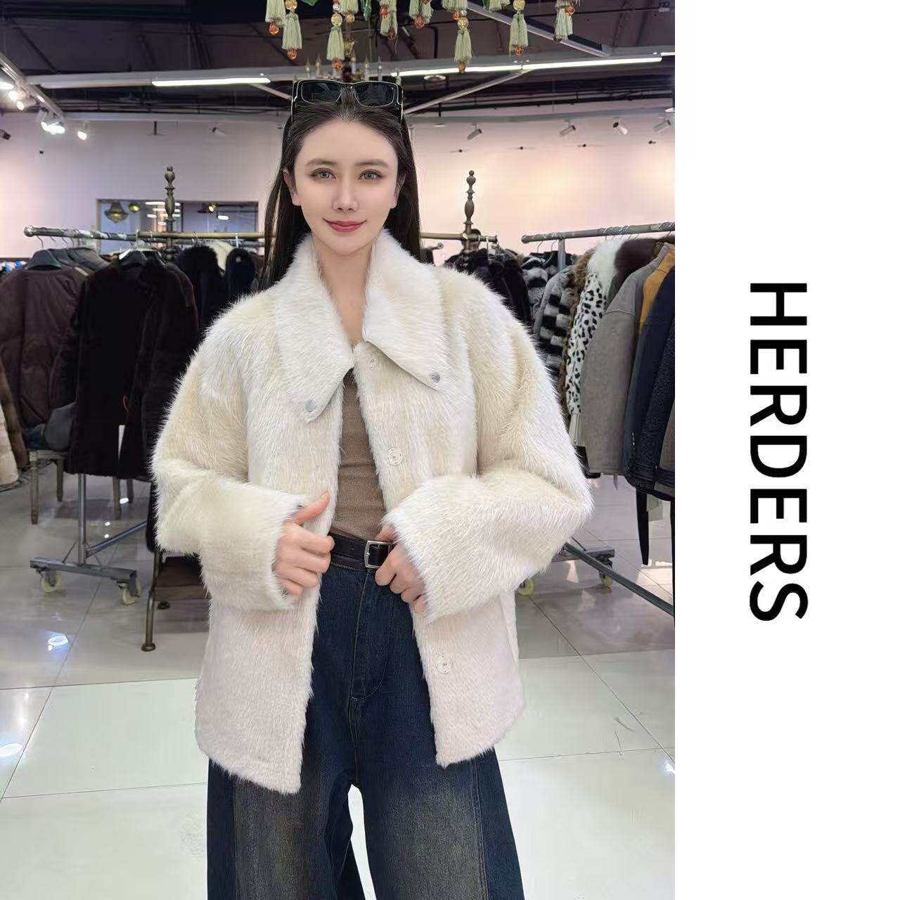HERDERS “校花羊系列”翻领中长款皮毛一体外套 52613