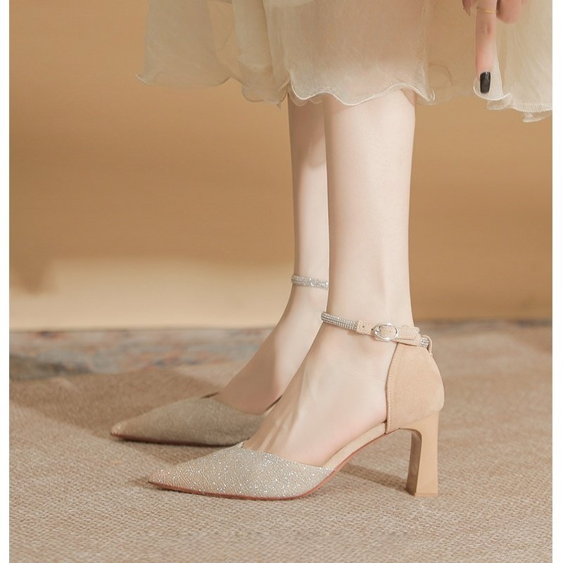 2026春秋新款绝美细闪水钻高跟鞋女一字扣包头凉鞋女温柔中空单鞋