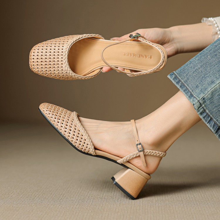 牛皮版~2025新款法式复古方头粗跟高跟鞋女一字扣带包头凉鞋外穿