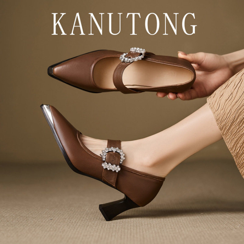 春夏新款法式气质真皮金属尖头高跟鞋女一字扣带粗跟浅口玛丽珍鞋