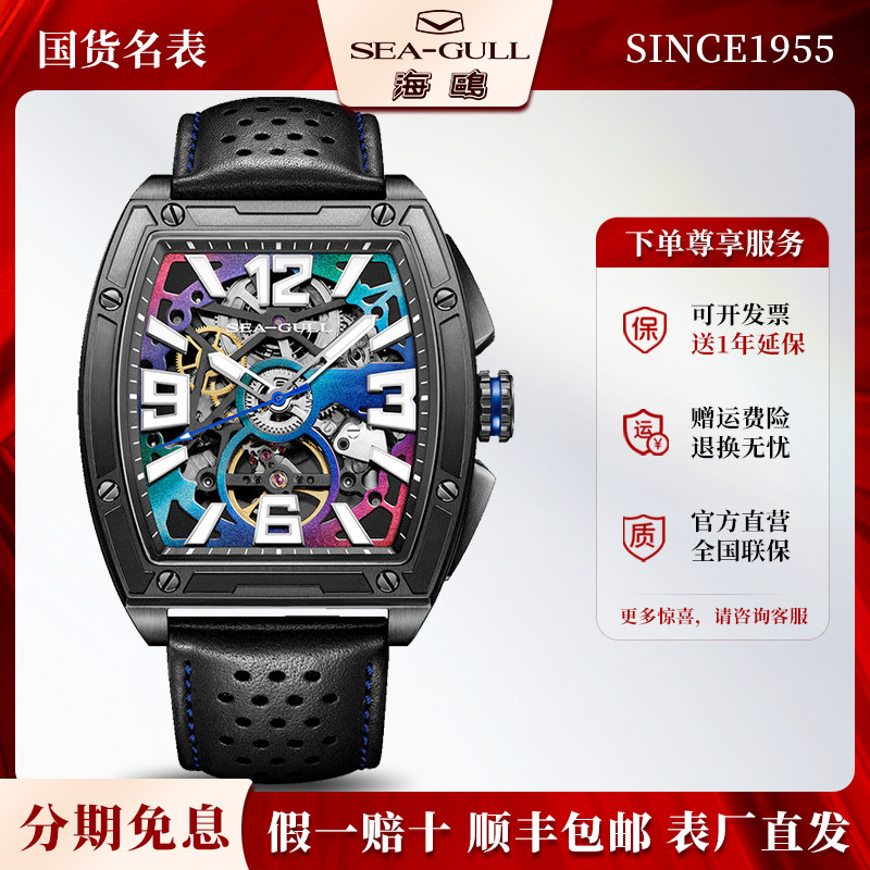正品海鸥手表男士夜光酒桶型镂空全自动机械表男表锋芒男款6094HK