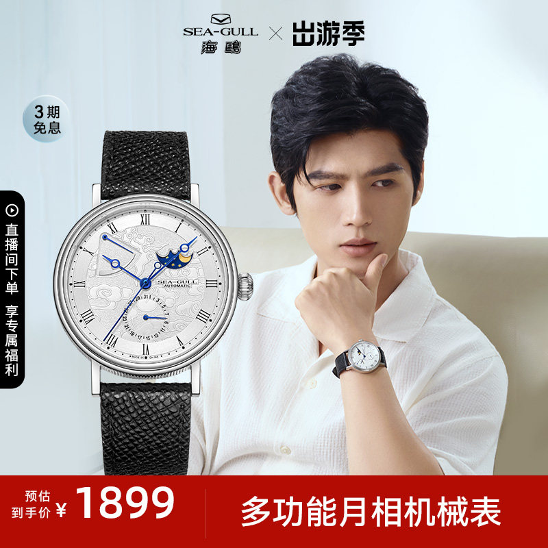 正品海鸥表外交官月相男士手表商务简约休闲全自动机械表男表1080
