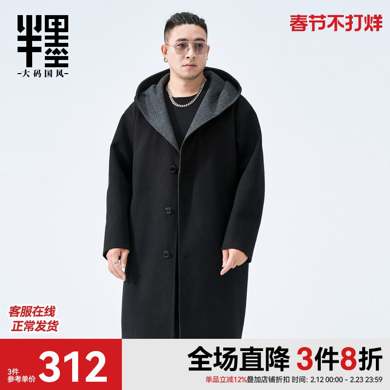 半墨中长款毛呢大衣男连帽宽松2025冬季新款撞色风衣外套大码男装