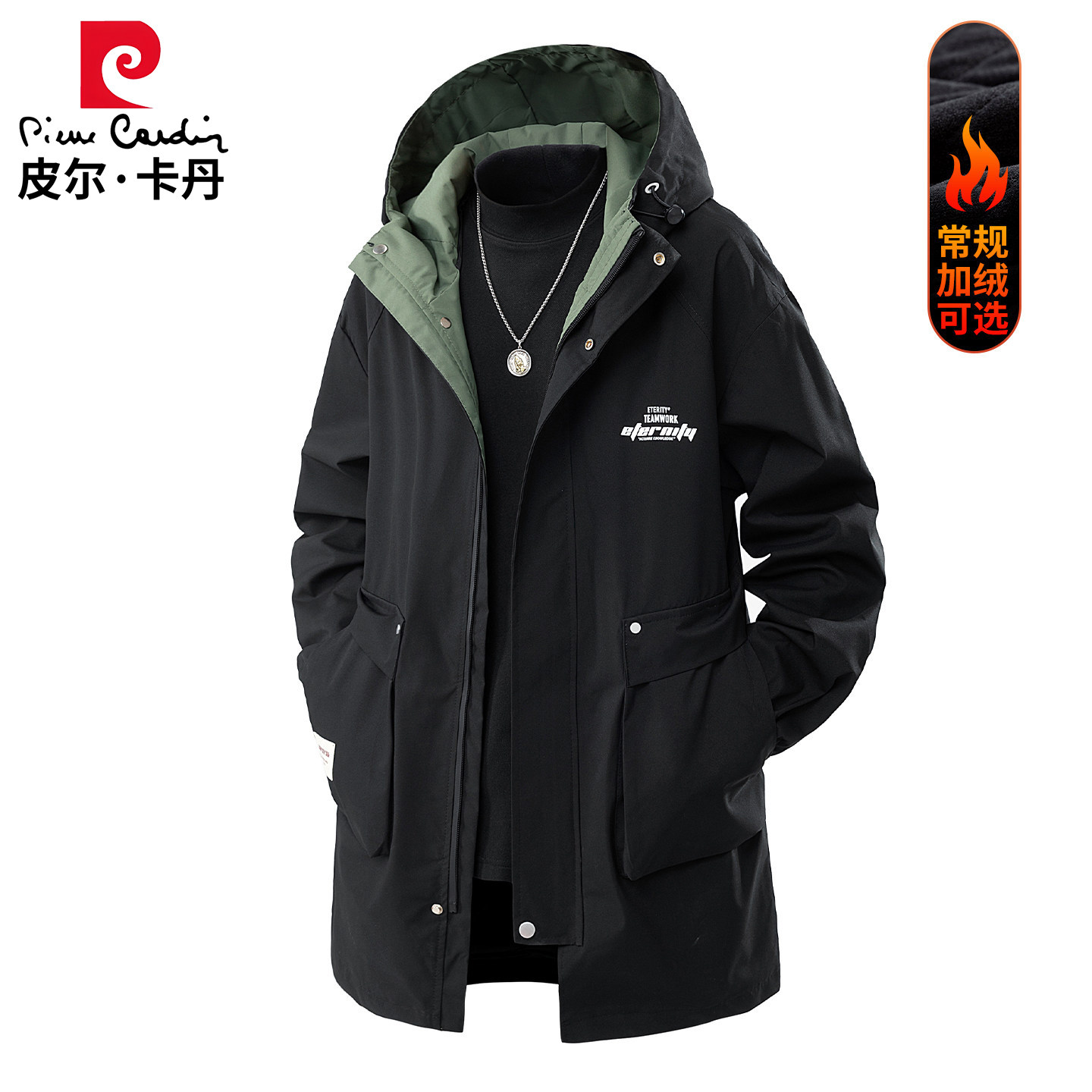 皮尔卡丹秋冬季风衣男士加绒加厚大码新款连帽防风工装中长款外套