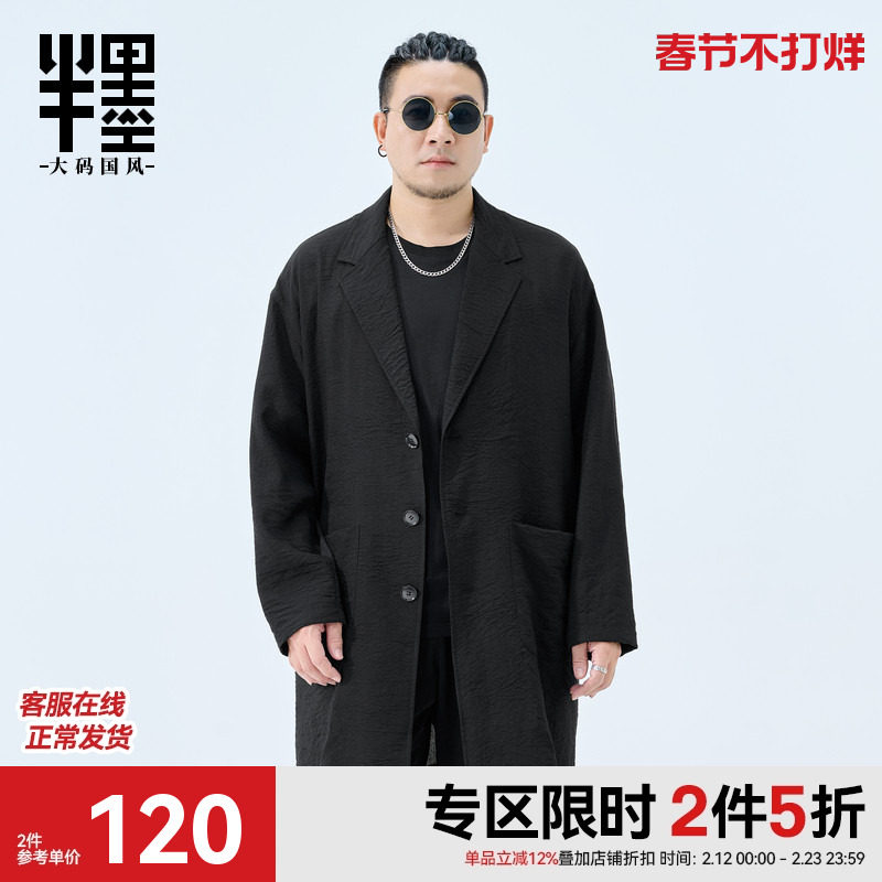 半墨大码男装西装领风衣男中长款秋季冰丝凉感大衣男宽松胖子外套