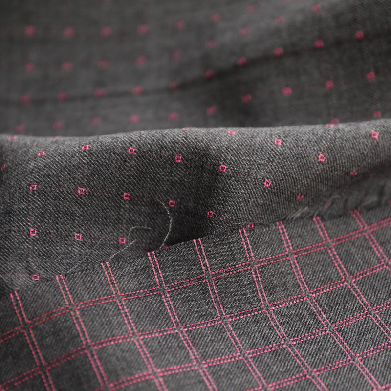 意大利进口薄款中灰桃粉色格纹贯穿提花细腻斜纹精纺羊毛面料布料