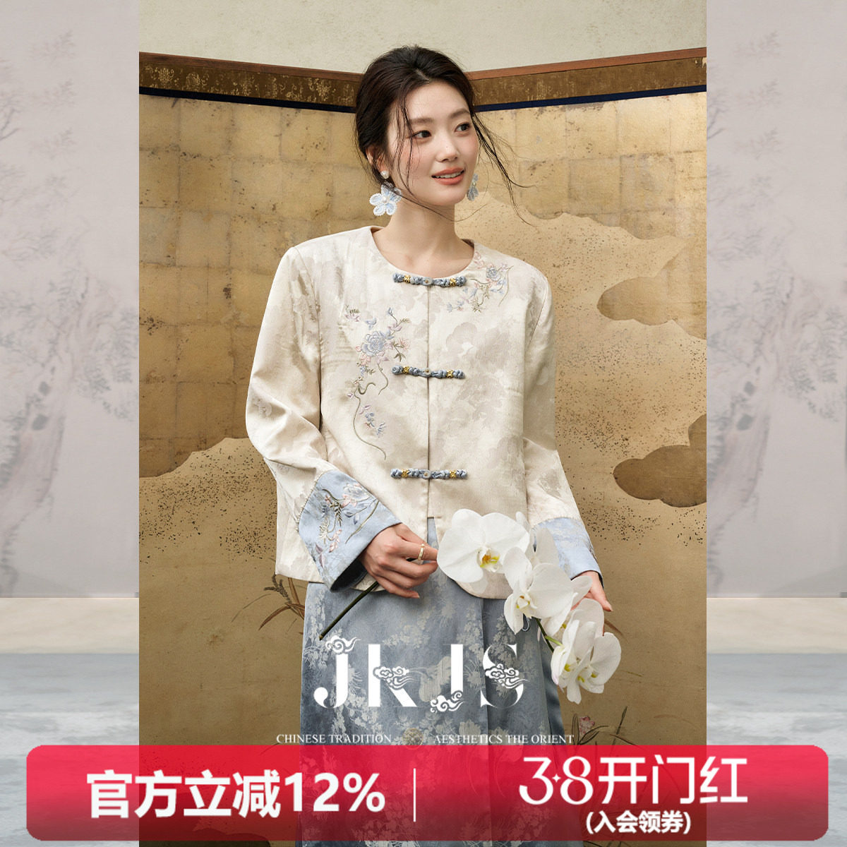 JKJS【清浅蓝调】人丝交织肌理提花 新中式外套女装盘扣国风上衣