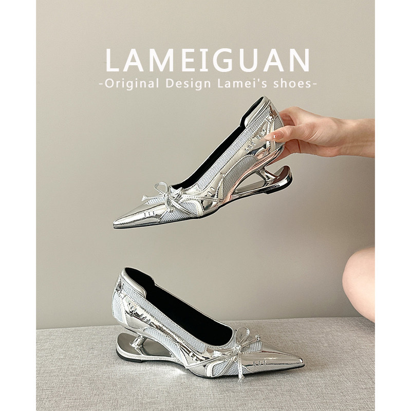 设计感尖头蝴蝶结运动风高跟鞋女春2026新款银色漆皮坡跟浅口单鞋