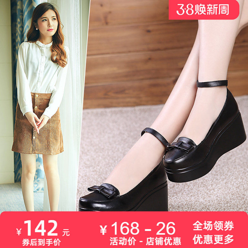 软面牛皮坡跟高跟单鞋春秋新款圆头浅口蝴蝶结舒适软底真皮女鞋子