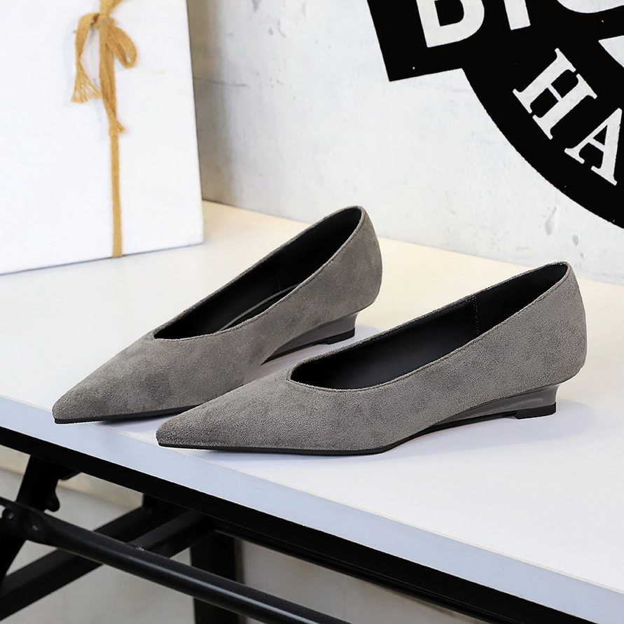尖头坡跟单鞋女灰色高跟鞋低跟浅口法式巨好看V口绒面职业不累脚