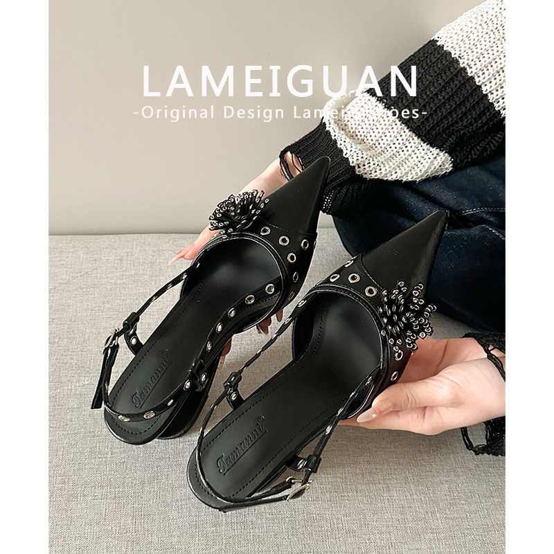 复古设计感铆钉花朵悬浮坡跟单鞋女2025春季新款黑色尖头高跟凉鞋
