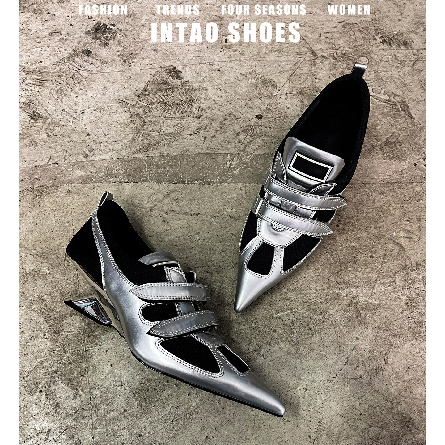 林向晚 高智千金~银色高跟鞋设计感小众坡跟学院通勤风尖头单鞋女