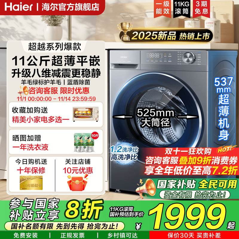 【政府补贴】海尔超薄11KG大容量滚筒洗衣机全自动家用旗舰店58E1