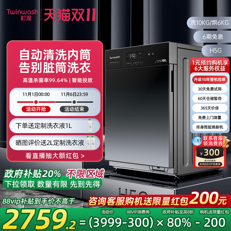 【筒真净】Twinwash町渥10公斤滚筒洗衣机全自动洗烘干一体机H5G