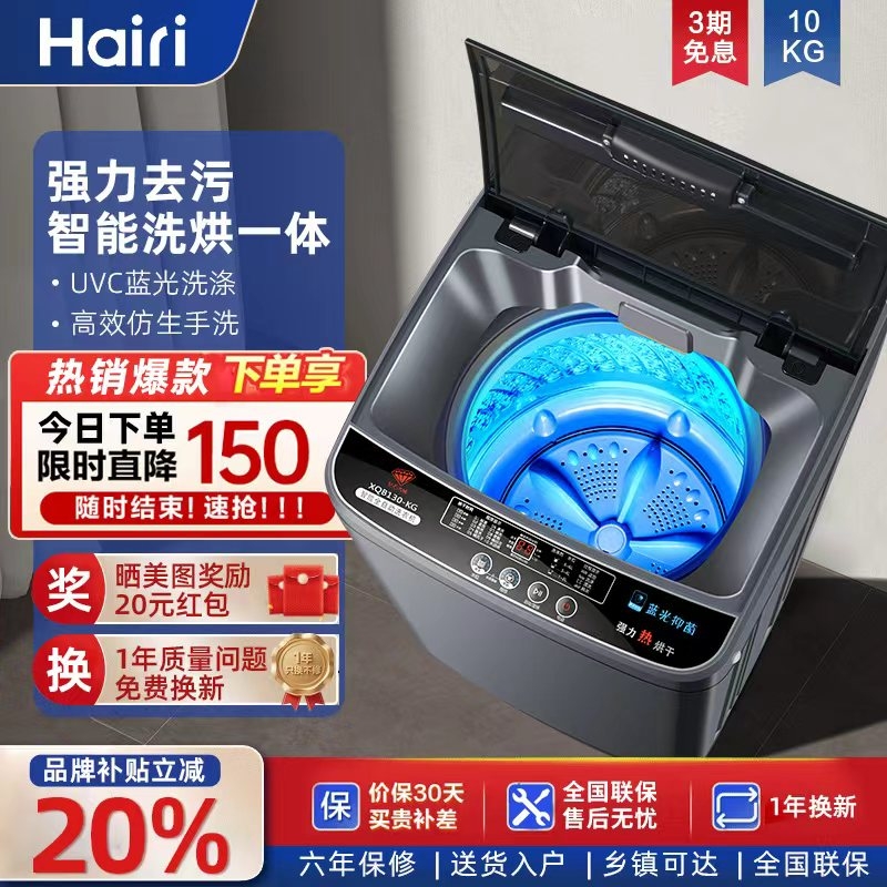 Hairi洗衣机全自动10/12KG小型波轮大容量租房宿舍洗烘一体家用