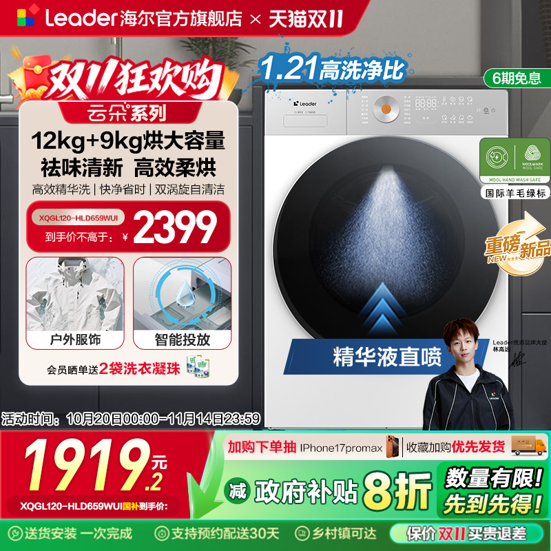 全民补贴海尔leader统帅12KG滚筒洗衣机全自动家用大容量洗烘一体