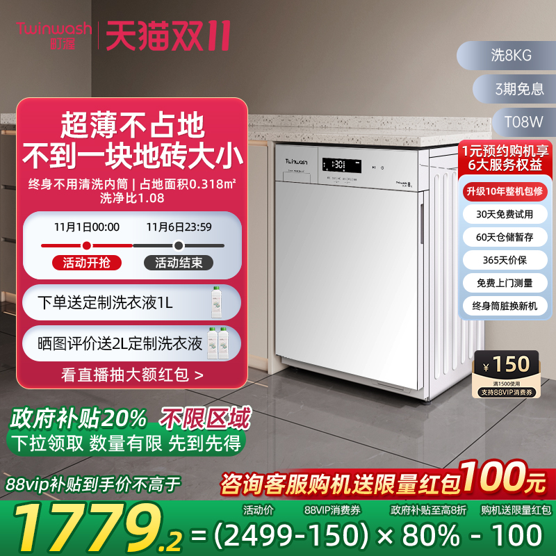 【小白豚】Twinwash町渥8kg筒真净超薄滚筒洗衣机全自动变频T08W