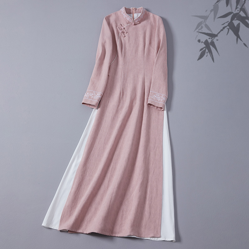 中国风秋冬新款中式复古改良旗袍裙棉麻绣花禅意茶服女修身连衣裙