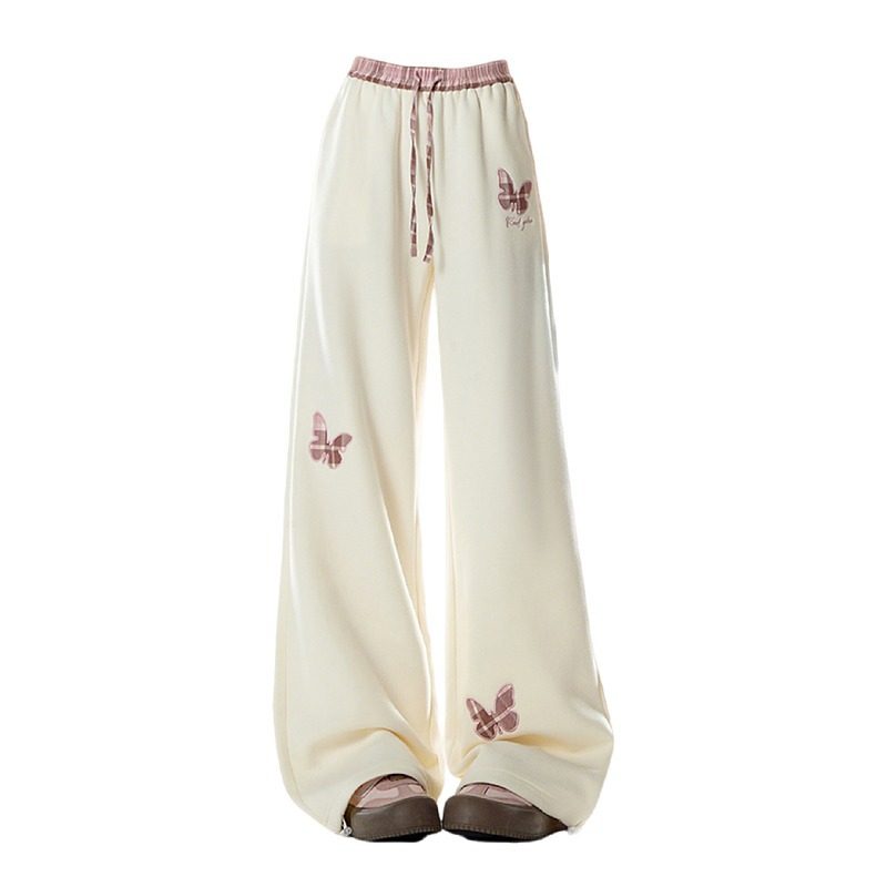 大码胖mm杏色蝴蝶贴布休闲长裤女秋冬季宽松百搭显瘦阔腿运动卫裤