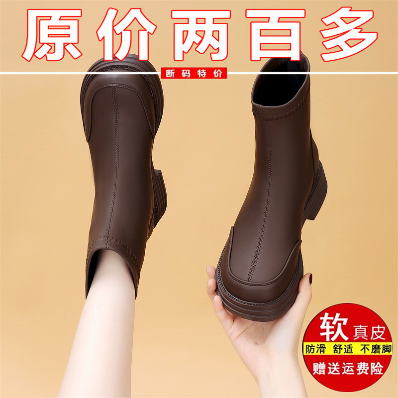 复古水洗牛皮切尔西马丁靴女短靴秋冬新款低跟老钱风粽色显瘦单靴