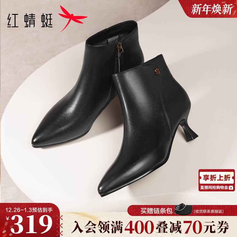 红蜻蜓高跟鞋2025冬季新款女鞋靴子细跟短靴真皮白色尖头皮鞋女靴