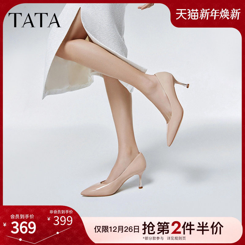 TATA他她女鞋2025新款尖头裸色高跟鞋通勤不累脚细跟真皮单鞋子
