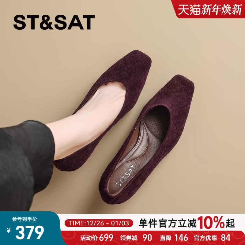 星期六法式绒面细跟红色高跟鞋女鞋2025秋季新款真皮单鞋职业鞋子