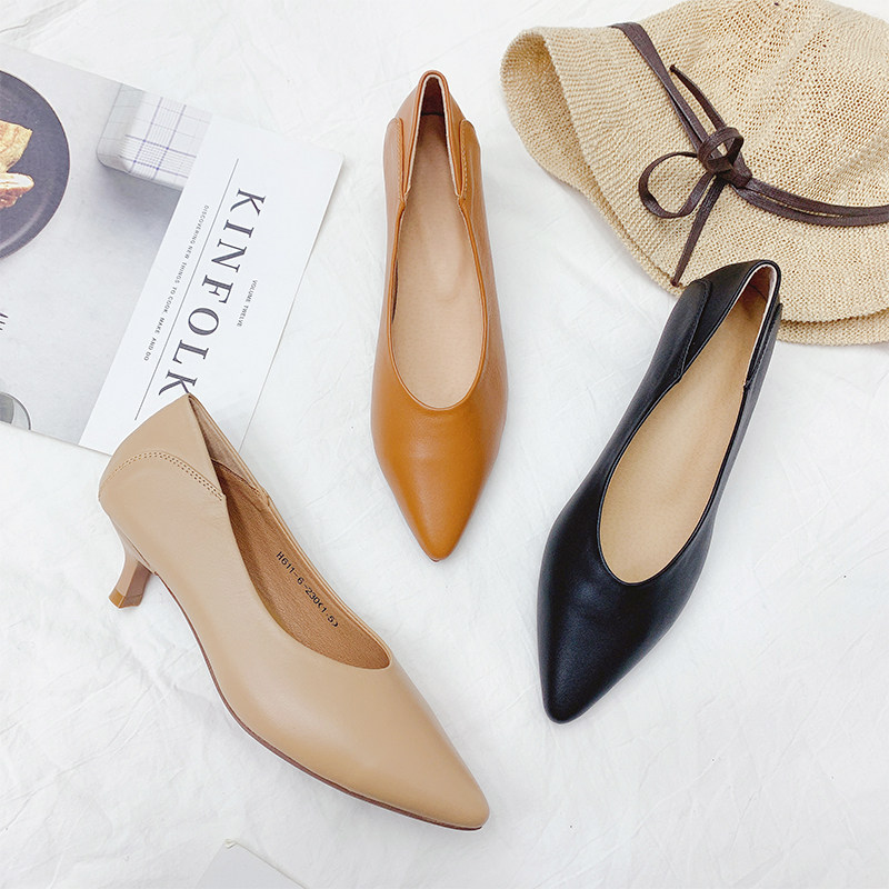 2021春季新款真皮高跟鞋细跟工作鞋百搭尖头女鞋猫跟5cm单鞋浅口