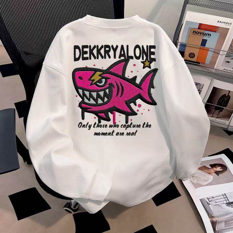 美式复古潮流卡通鲨鱼印花卫衣男宽松秋冬季ins潮牌长袖加绒上衣