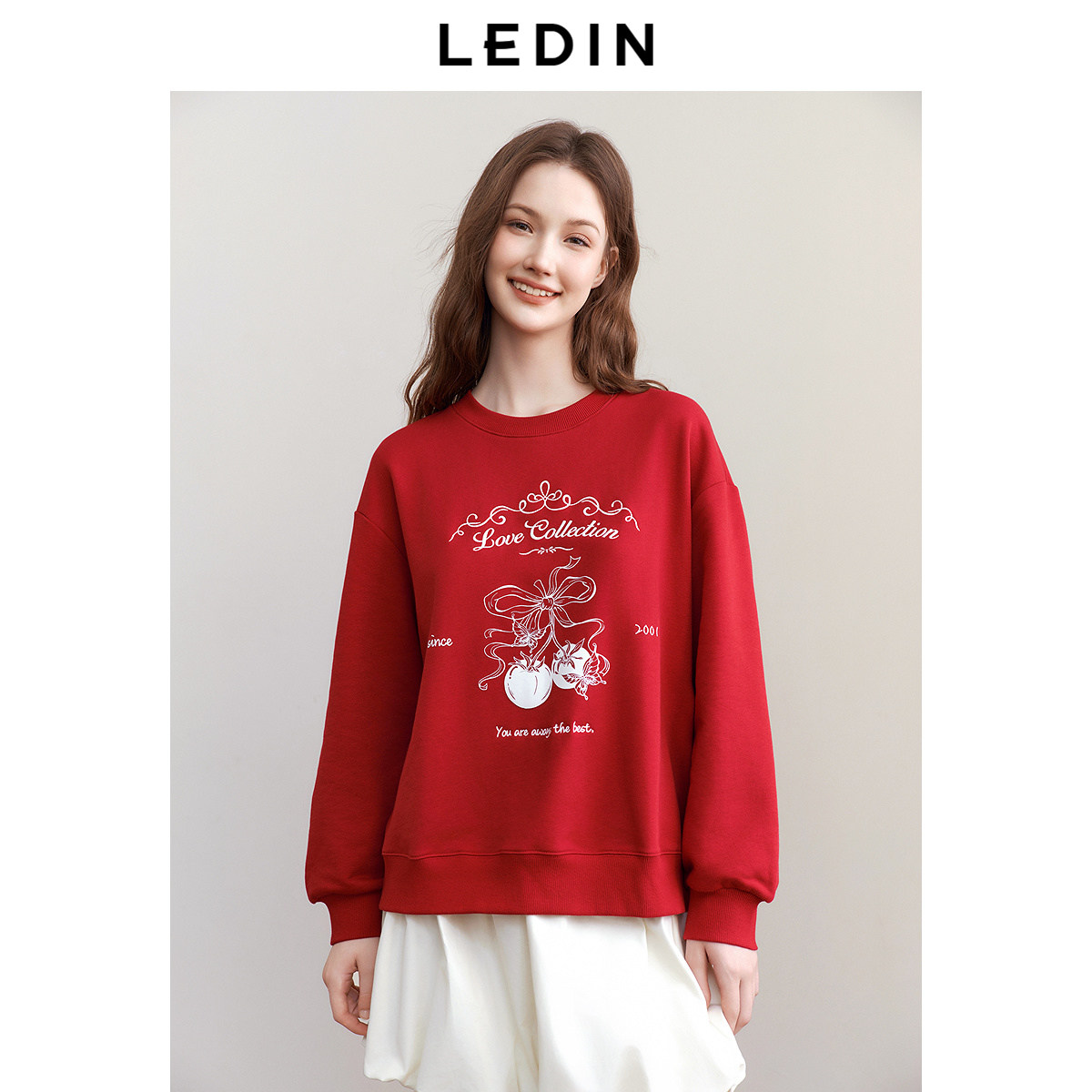 乐町新年红色圆领卫衣2025春季新款宽松卫衣卡通字母印花休闲上衣