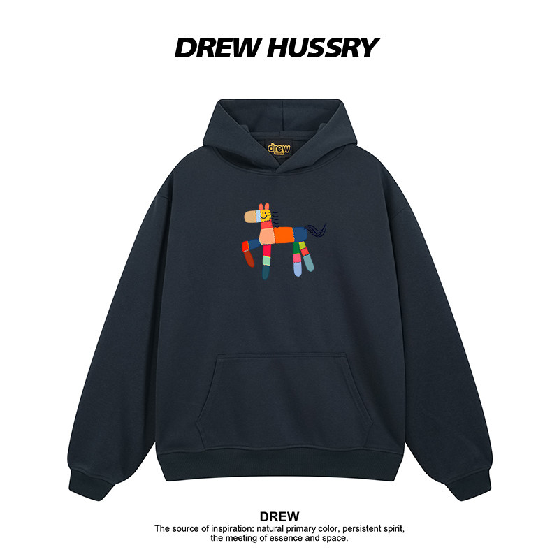 Drew美式潮牌卡通小马印花圆领纯棉连帽卫衣男女情侣装宽松上衣