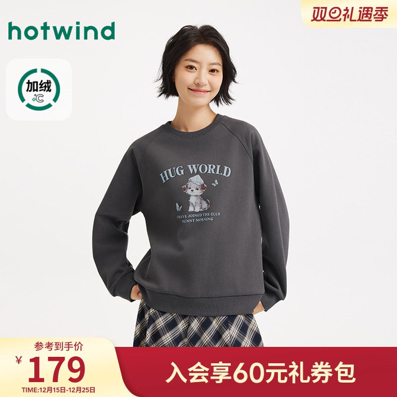 热风女士加绒卫衣2025年冬季新款卡通狗印花圆领加绒卫衣保暖上衣