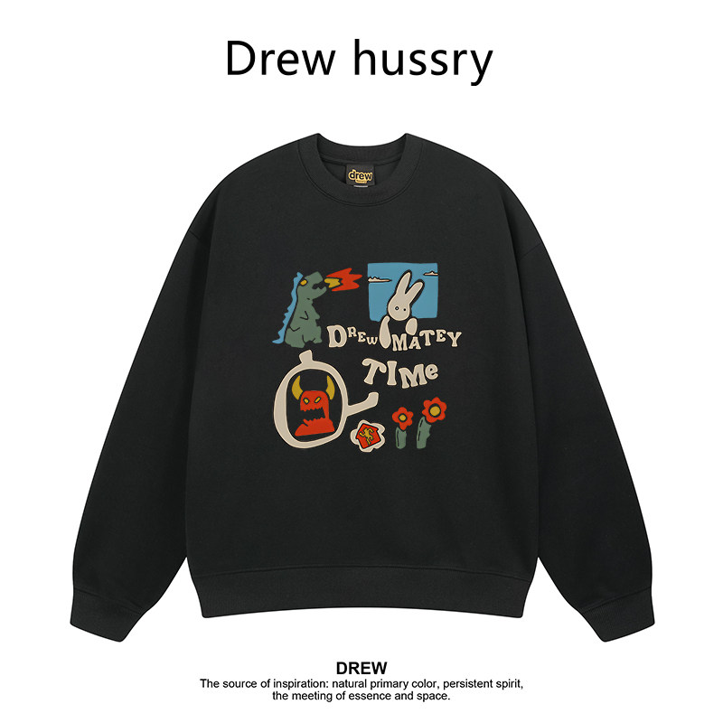 Drew美式卡通印花圆领卫衣男女纯棉新款秋冬季加绒加厚宽松上衣服
