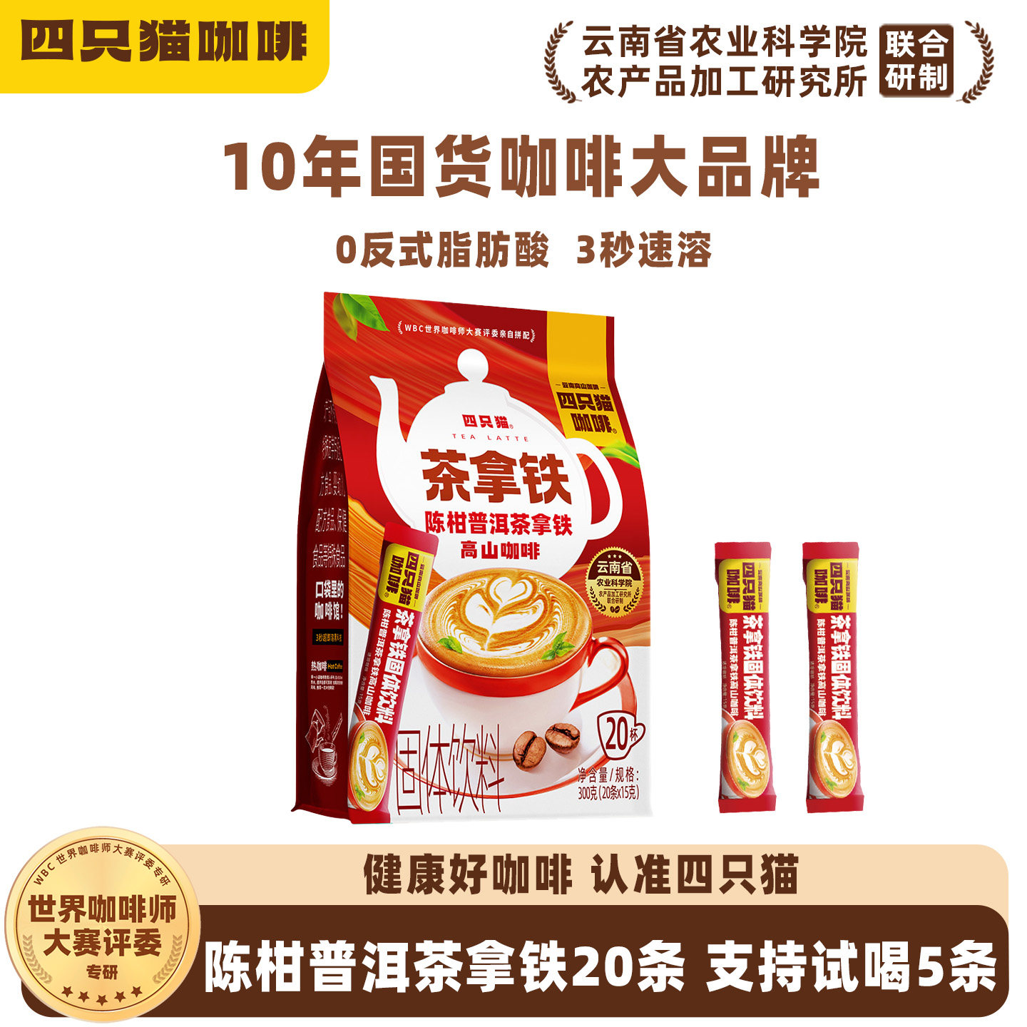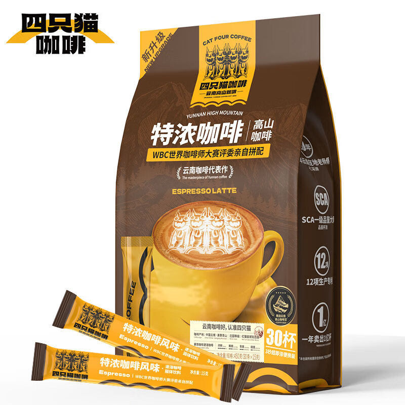 四只猫拿铁蓝山三合一速溶咖啡粉云南高山小粒咖啡0添加提神送杯