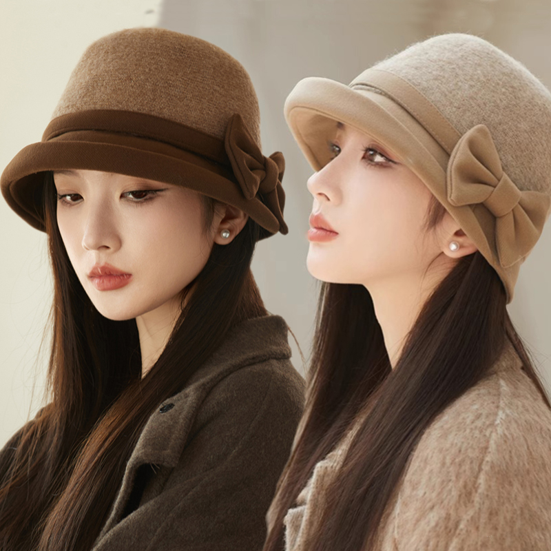 2025秋冬新款羊毛呢渔夫帽子女法式复古赫本风蝴蝶结气质名媛礼帽