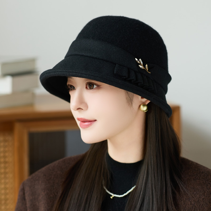 赫本风蝴蝶结毛呢渔夫帽女气质黑色盆帽韩版优雅圆顶礼帽悬崖之上