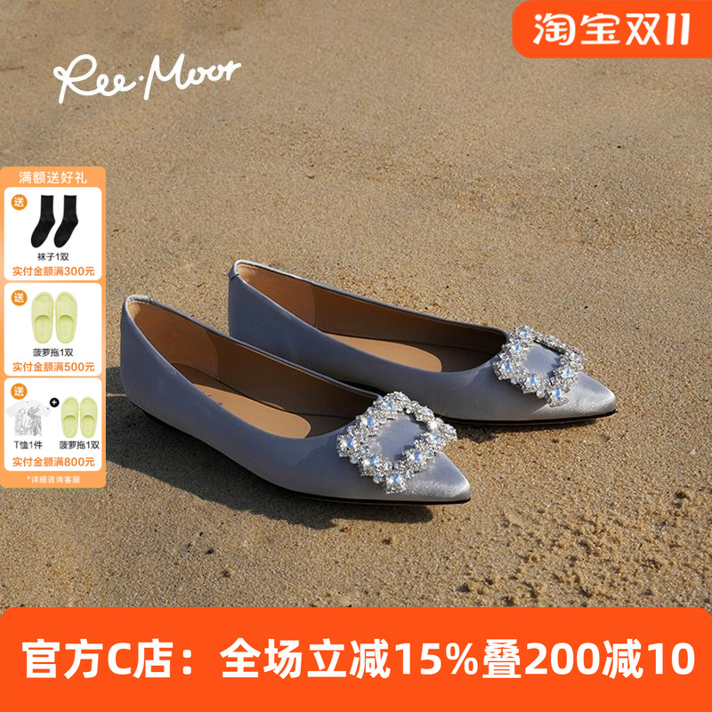 REEMOOR睿慕2025秋季新款软底尖头浅口单鞋方扣水钻平底鞋婚鞋女