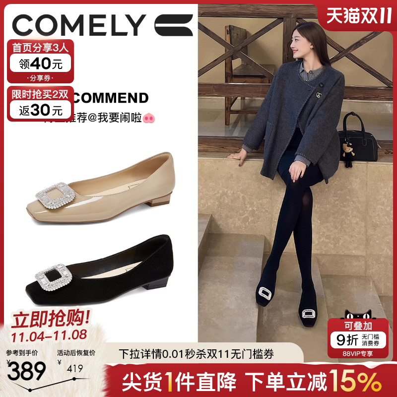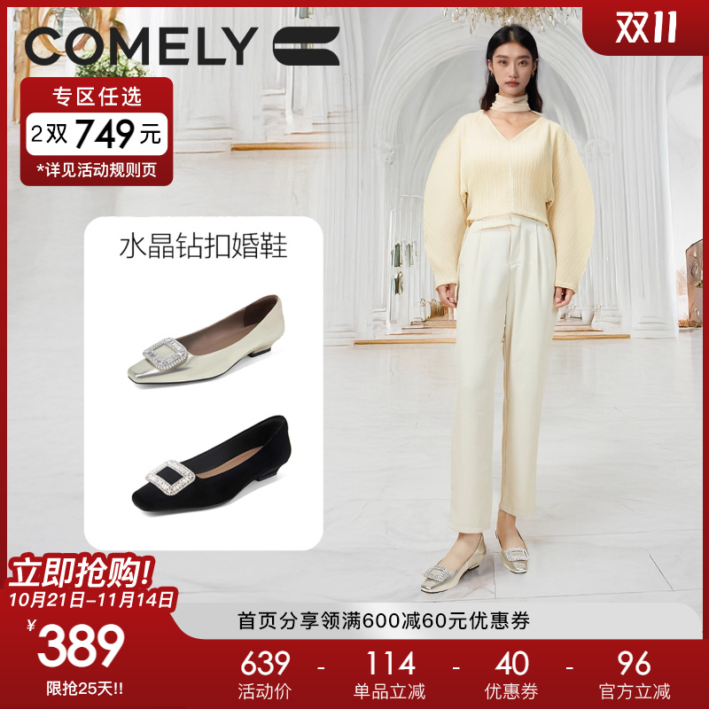 [明星同款]康莉平底单鞋女春秋新款水钻方扣真皮气质通勤浅口女鞋