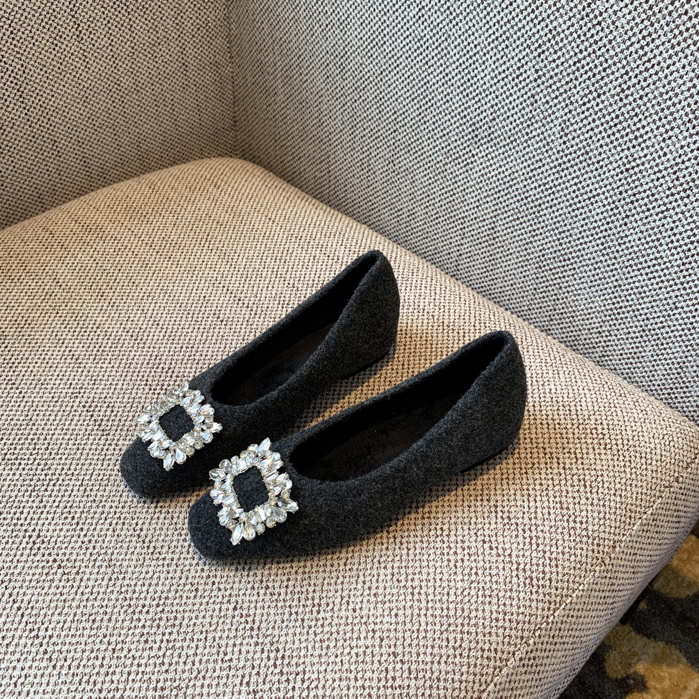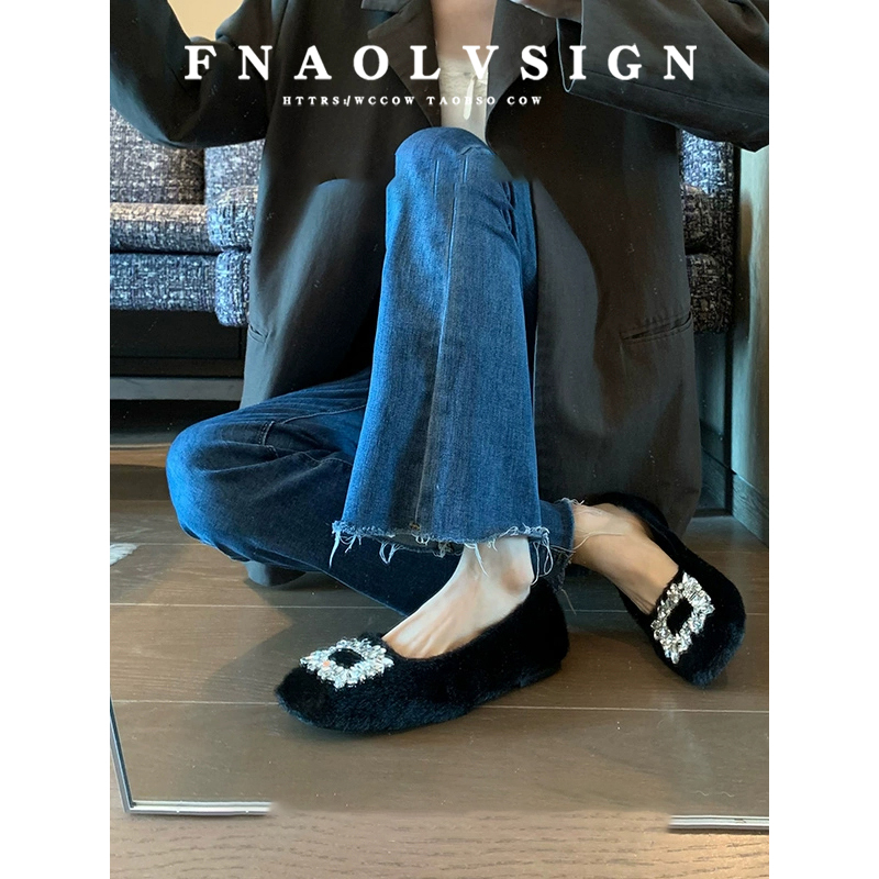 2025秋冬新款尖头水钻方扣内加绒平底单鞋保暖平跟毛毛鞋浅口女鞋
