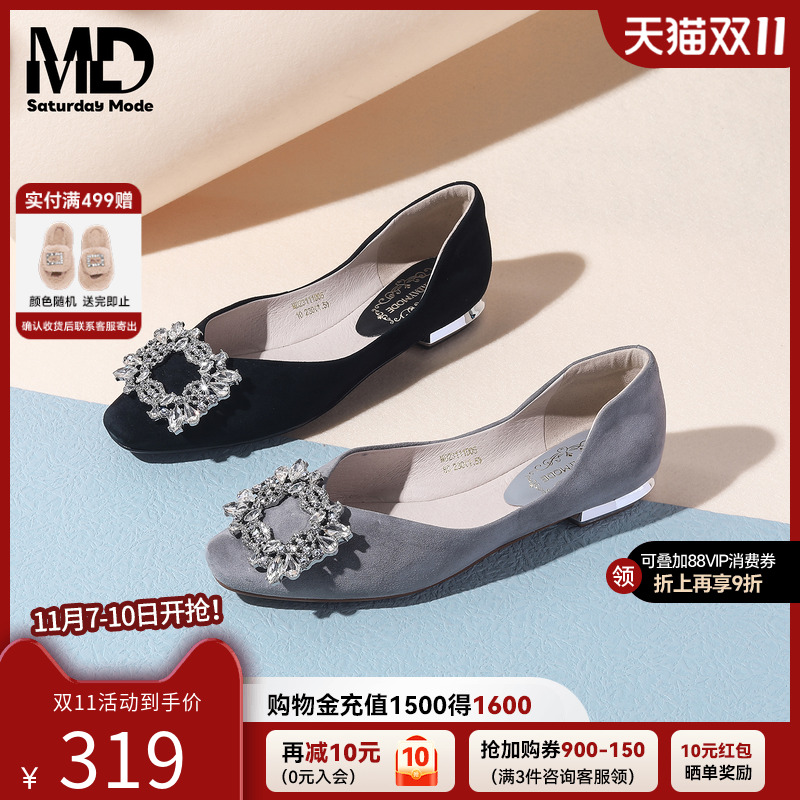 MD女鞋方扣水钻平底鞋春夏新款黑色绒面羊皮一脚蹬低跟通勤单鞋