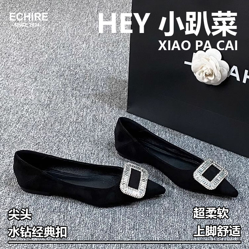 2024春秋季新款尖头气质名媛平底丝绒单鞋真皮水钻方扣软底瓢鞋女