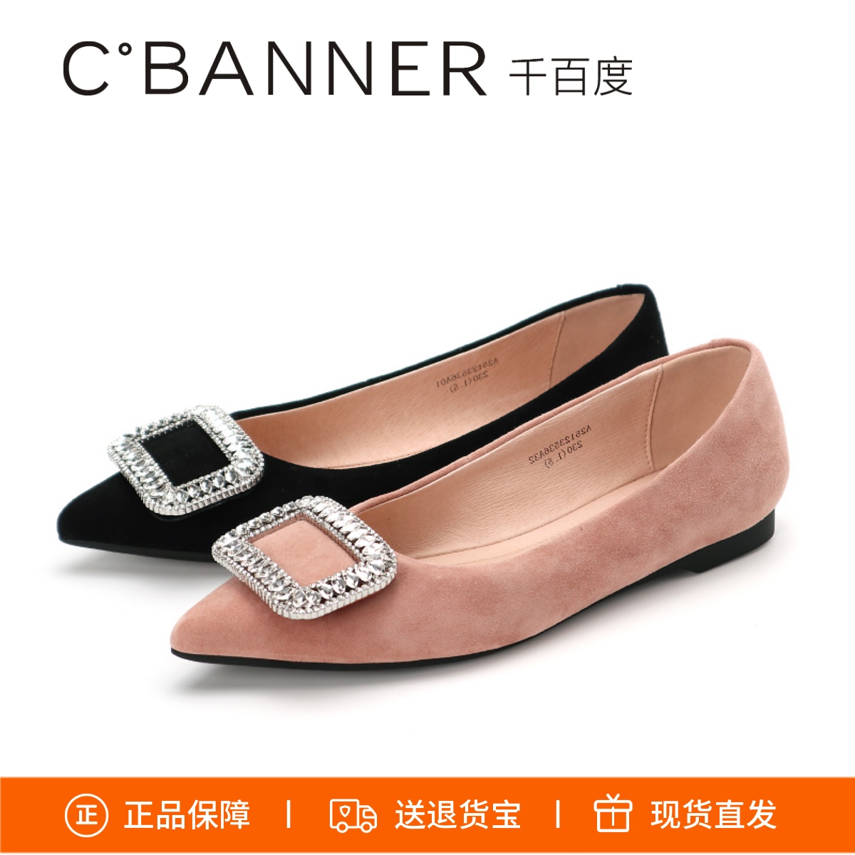 千百度2025新款尖头方扣水钻平底鞋绒面通勤单鞋A25123536A01A32