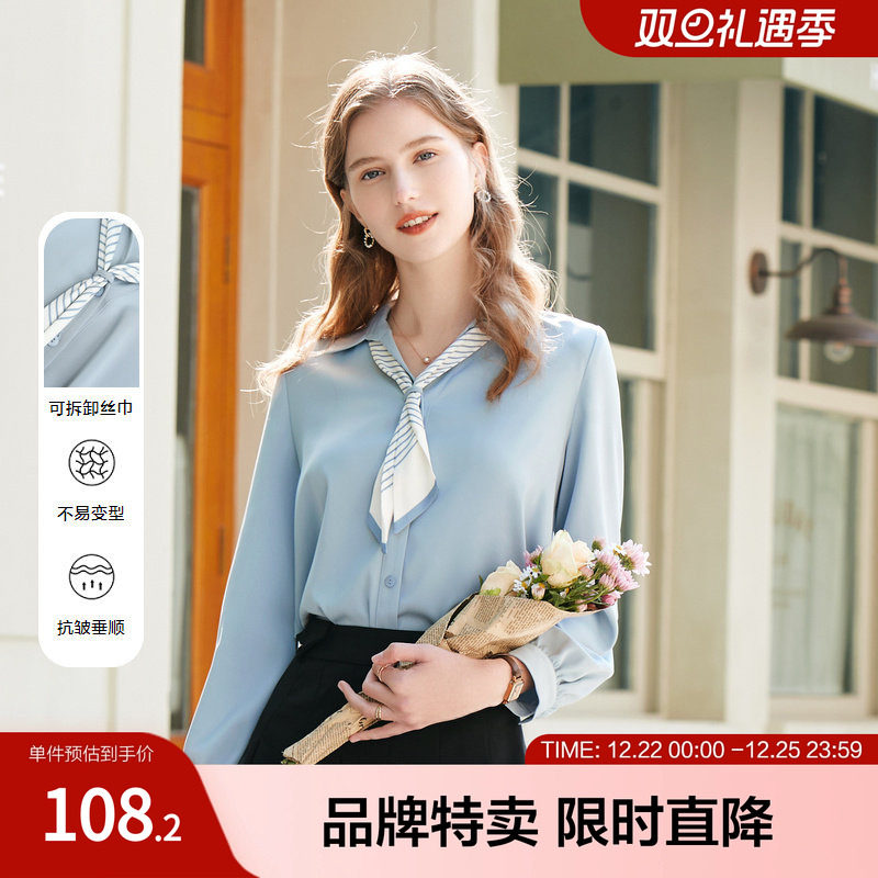 雪纺衬衫女春夏长袖温柔蓝色职业小众雪纺衫垂感薄款气质上衣衬衣