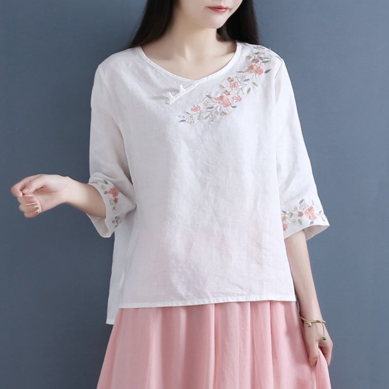 中老妈妈大码棉麻T恤衬衫女夏新款民族风刺绣宽松遮肚五分袖上衣