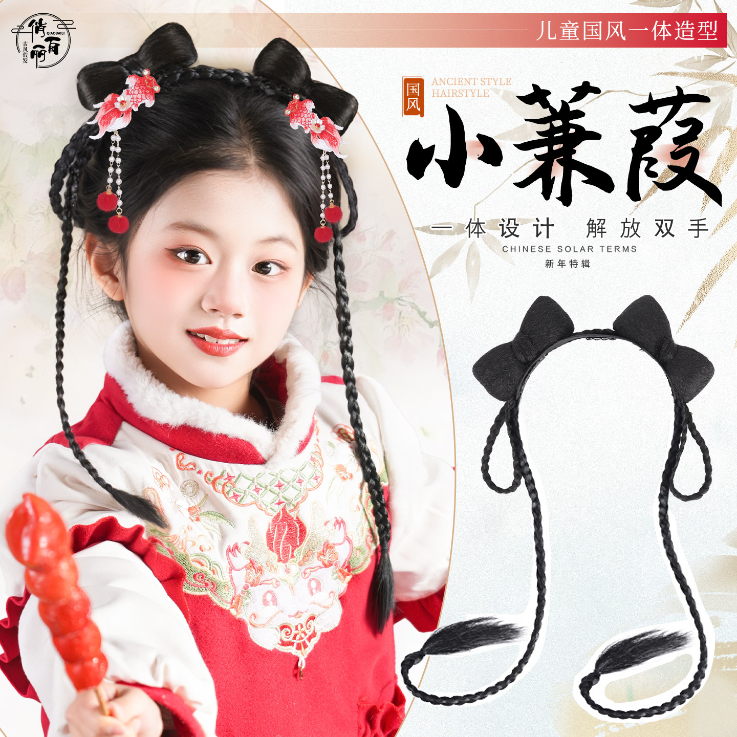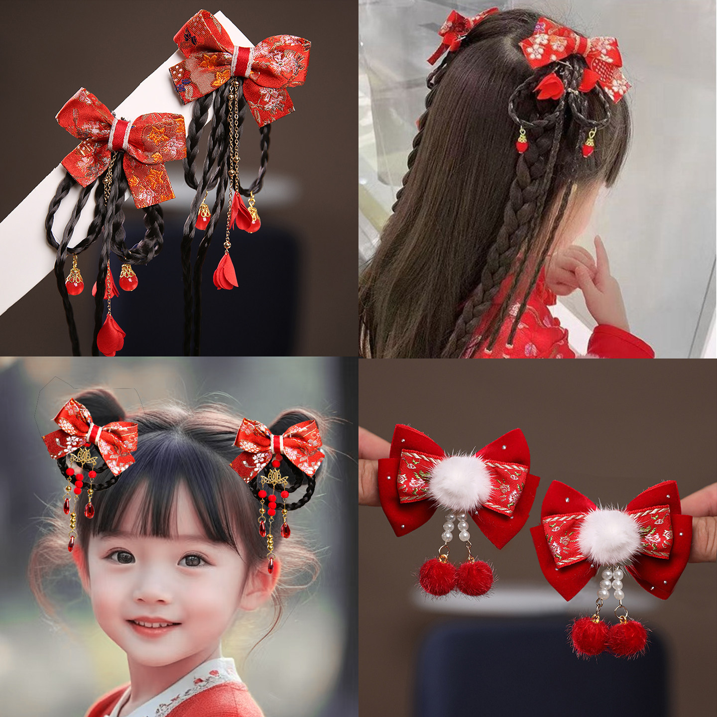 春节红色蝴蝶结儿童假发发夹中式古风女宝宝汉服古装头饰马年新款