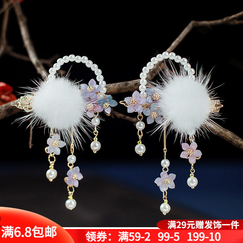 古装头饰汉服毛球流苏发夹仙气手工珍珠夹子毛绒边夹少女古风发饰