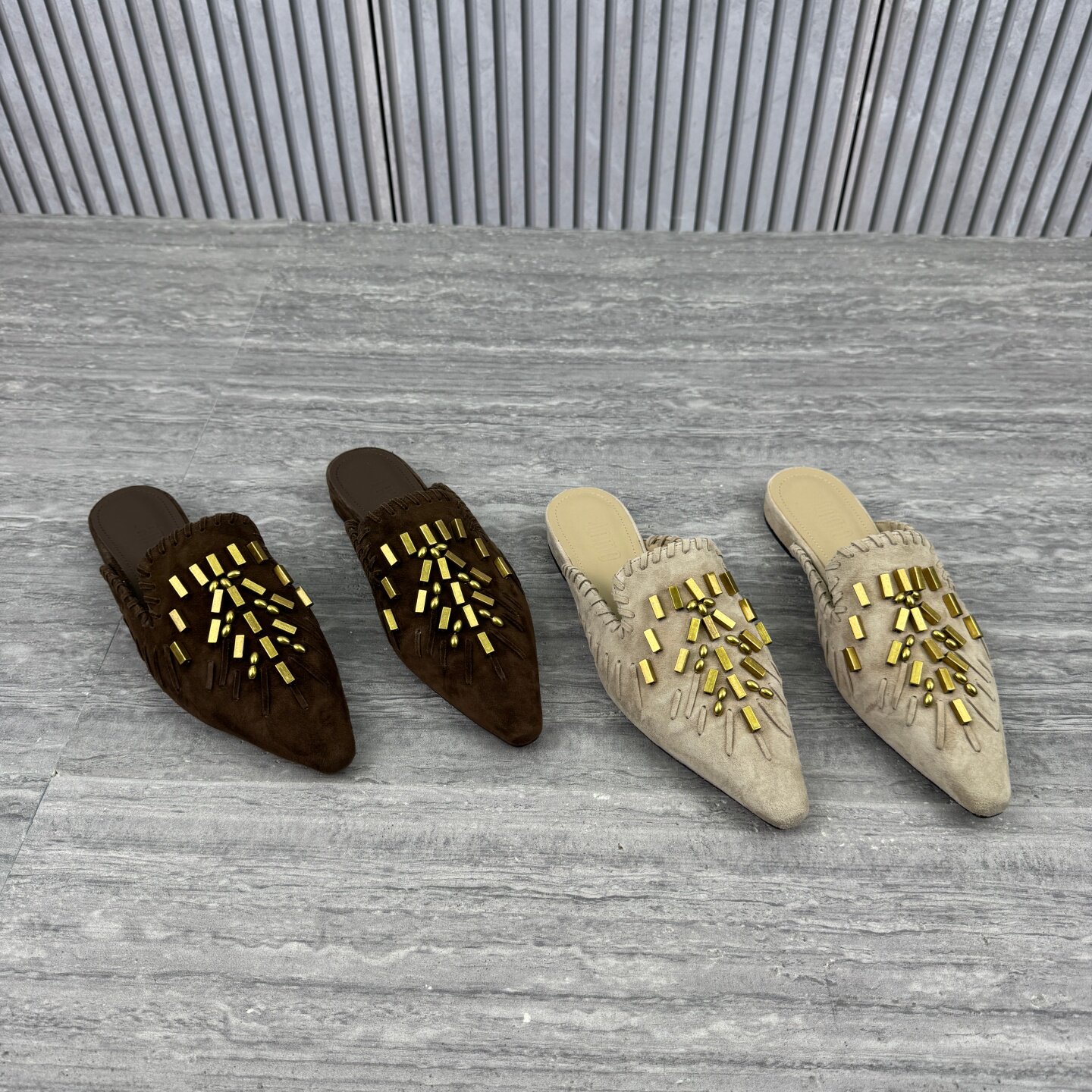 欧货欧洲站2026春季新款铆钉平跟包头拖鞋磨砂皮时尚尖头半拖女鞋