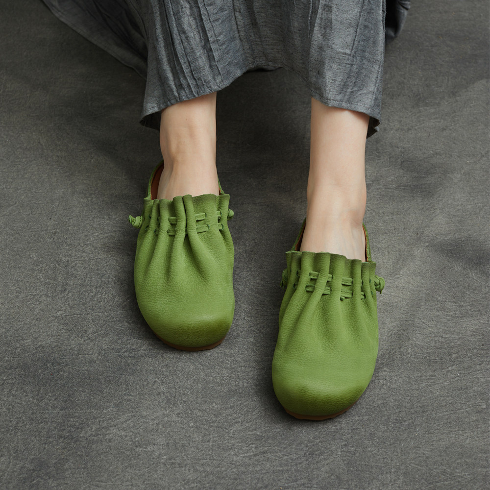 平跟包头半拖鞋2026春夏新款真皮手工褶皱圆头手工复古软底套脚鞋