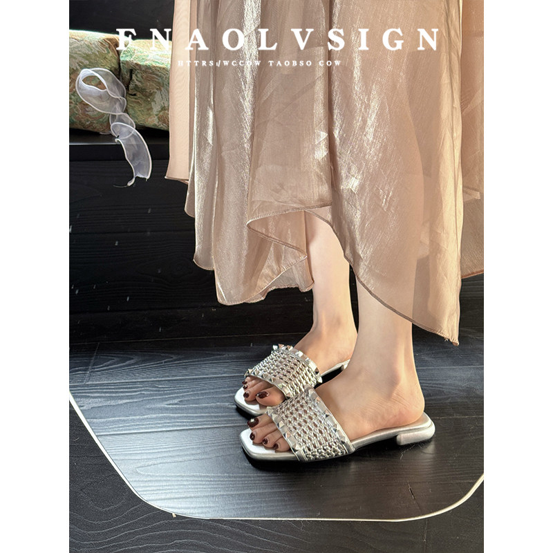 羊皮版~编织一字拖女2026年夏外穿平跟方头银色气质平底凉拖鞋女